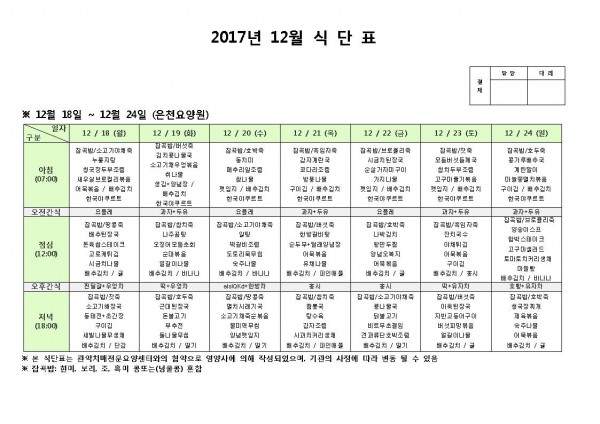 12월 넷째주 식단표 페이지 정보 작성자 은천노인복지회 작성일17-12-18 16:58 조회189,439회 댓글0건 관련링크 이전글 다음글 목록 답변 본문 12월 넷째주 식단표 이전글 다음글 목록 답변