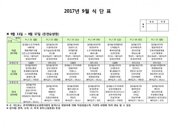 9월 둘째주 식단표 페이지 정보 작성자 은천노인복지회 작성일17-09-11 17:01 조회180,687회 댓글0건 관련링크 이전글 다음글 목록 답변 본문 9월 둘째주 식단표 이전글 다음글 목록 답변