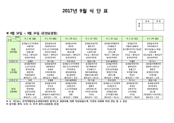 9월 셋째주 식단표 페이지 정보 작성자 은천노인복지회 작성일17-09-18 11:02 조회182,250회 댓글0건 관련링크 이전글 다음글 목록 답변 본문 9월 셋째주 식단표 이전글 다음글 목록 답변