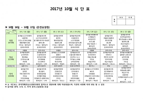 10월 셋째주 식단표 페이지 정보 작성자 은천노인복지회 작성일17-10-17 17:39 조회182,943회 댓글0건 관련링크 이전글 다음글 목록 답변 본문 10월 셋째주 식단표 이전글 다음글 목록 답변