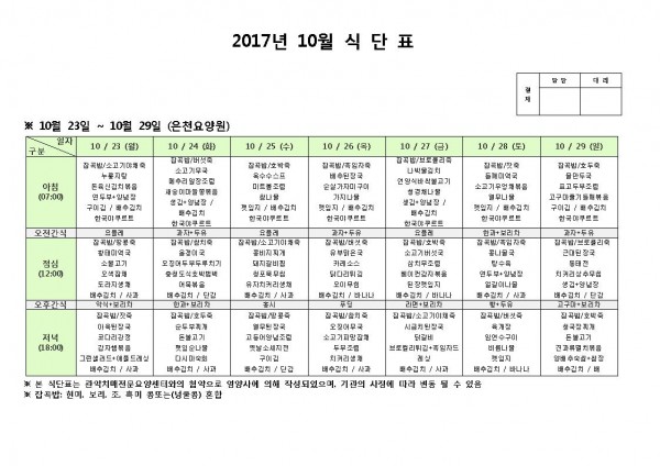 10월 넷째주 식단표 페이지 정보 작성자 은천노인복지회 작성일17-10-23 11:19 조회183,871회 댓글0건 관련링크 이전글 다음글 목록 답변 본문 10월 넷째주 식단표 이전글 다음글 목록 답변