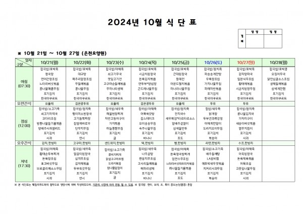 10월 넷째주 식단표 페이지 정보 작성자 은천노인복지회 작성일24-10-18 10:37 조회19,050회 댓글0건 관련링크 이전글 다음글 목록 답변 본문 . 이전글 다음글 목록 답변