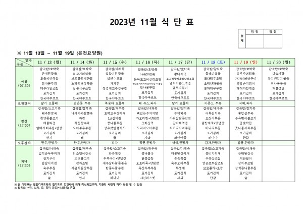 11월 셋째주 식단표 페이지 정보 작성자 은천노인복지회 작성일23-11-10 13:17 조회35,921회 댓글0건 관련링크 이전글 다음글 목록 답변 본문 . 이전글 다음글 목록 답변