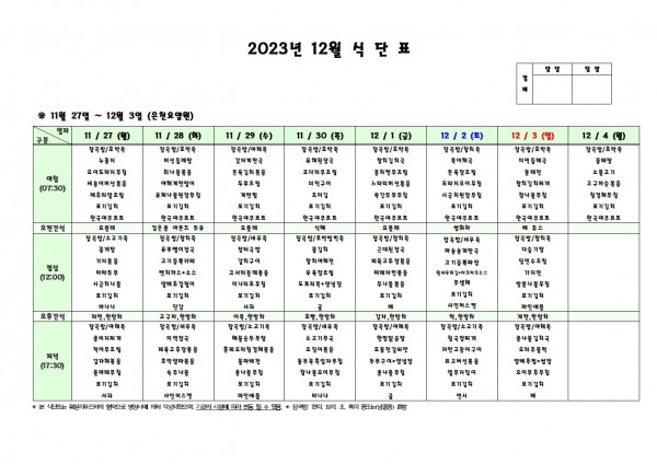 12월 첫째주 식단표 페이지 정보 작성자 은천노인복지회 작성일23-11-24 09:37 조회34,089회 댓글0건 관련링크 이전글 다음글 목록 답변 본문 . 이전글 다음글 목록 답변