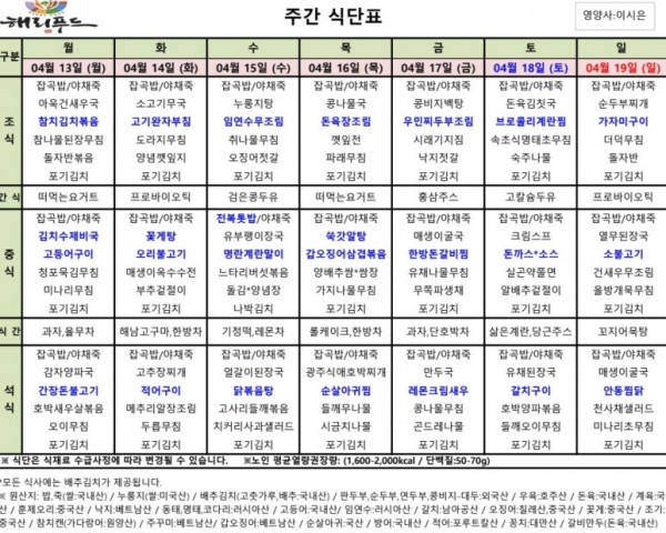 4월 둘째주 식단표 페이지 정보 작성자 은천노인복지회 작성일26-04-14 14:54 조회480회 댓글0건 관련링크 이전글 다음글 목록 답변 본문 4월 둘째주 어르신 식단표 안내해 드립니다. 정성과 영양을 담아 준비하겠습니다. 이전글 다음글 목록 답변