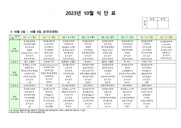 10월 첫째주 식단표 페이지 정보 작성자 은천노인복지회 작성일23-10-05 17:41 조회37,488회 댓글0건 관련링크 이전글 다음글 목록 답변 본문 . 이전글 다음글 목록 답변