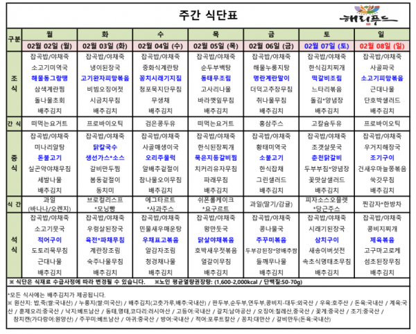 2월 첫째주 식단표 페이지 정보 작성자 은천노인복지회 작성일26-02-04 11:48 조회1,578회 댓글0건 관련링크 이전글 다음글 목록 답변 본문 2월 첫째주 어르신 식단표 안내해 드립니다. 정성과 영양을 담아 준비하겠습니다. 이전글 다음글 목록 답변