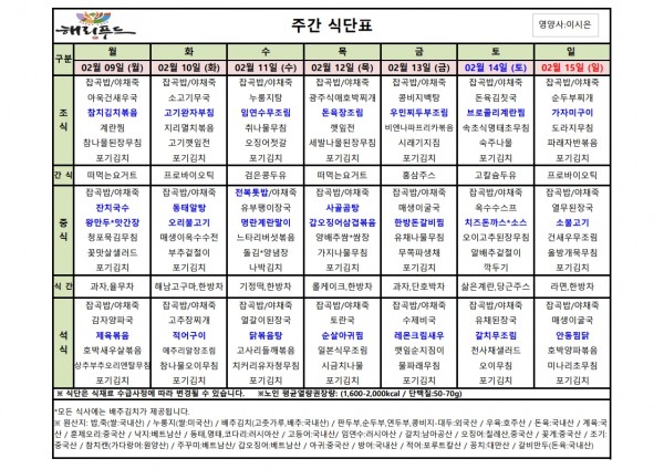 2월 둘째주 식단표 페이지 정보 작성자 은천노인복지회 작성일26-02-06 11:17 조회1,320회 댓글0건 관련링크 이전글 다음글 목록 답변 본문 2월 둘째주 어르신 식단표 안내해 드립니다. 정성과 영양을 담아 준비하겠습니다. 이전글 다음글 목록 답변