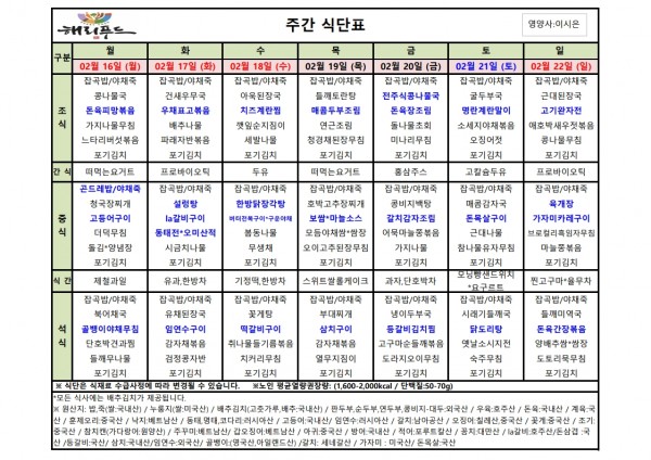 2월 셋째주 식단표 페이지 정보 작성자 은천노인복지회 작성일26-02-12 17:43 조회815회 댓글0건 관련링크 이전글 다음글 목록 답변 본문 2월 셋째주 어르신 식단표 안내해 드립니다. 정성과 영양을 담아 준비하겠습니다. 이전글 다음글 목록 답변