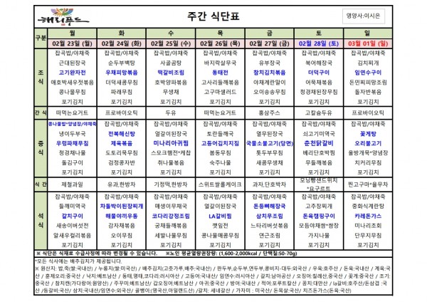 2월 넷째주 식단표 페이지 정보 작성자 은천노인복지회 작성일26-02-20 16:17 조회511회 댓글0건 관련링크 다음글 목록 답변 본문 2월 넷째주 어르신 식단표 안내해 드립니다. 정성과 영양을 담아 준비하겠습니다. 다음글 목록 답변