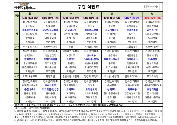 4월 첫째주 식단표 페이지 정보 작성자 은천노인복지회 작성일26-04-03 17:58 조회455회 댓글0건 관련링크 다음글 목록 답변 본문 4월 첫째주 어르신 식단표 안내해 드립니다. 정성과 영양을 담아 준비하겠습니다. 다음글 목록 답변