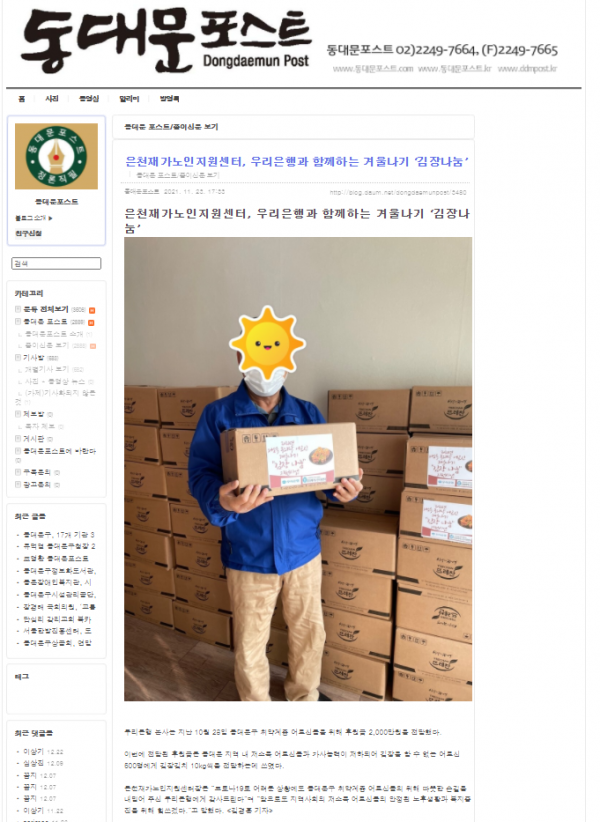 동대문포스트 김장기사 페이지 정보 작성자 은천노인복지회 작성일21-12-29 17:25 조회9,125회 댓글0건 관련링크 https://blog.daum.net/dongdaemunpost/3480 5431회 연결 목록 답변 본문 동대문포스트에 김장나눔 행사 기사입니다~ 목록 답변