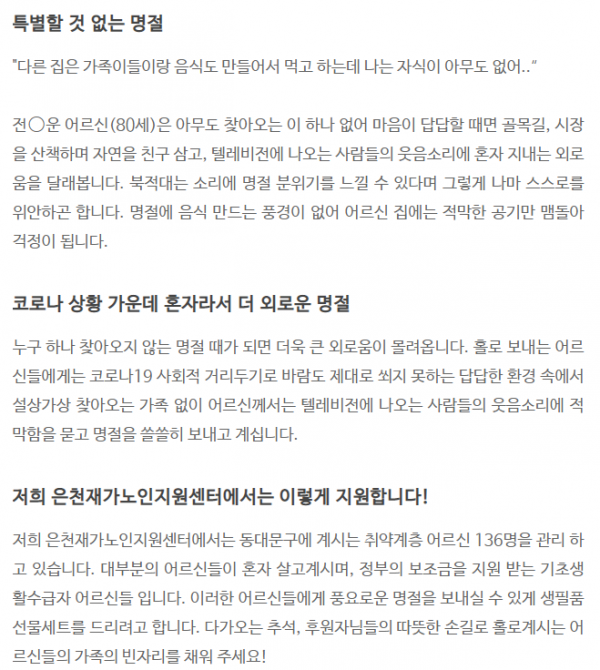 취약계층 어르신을 위한 추석선물 모금활동 페이지 정보 작성자 은천노인복지회 작성일21-08-23 10:22 조회29,636회 댓글0건 관련링크 https://happybean.naver.com/donations/H000000178857 21749회 연결 목록 본문 취약계층 어르신의 추석선물 지원을 위해 해피빈에서 모금활동을 하고 있습니다~ 모금활동에 많은 동참을 부탁드립니다~ 목록