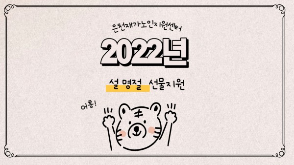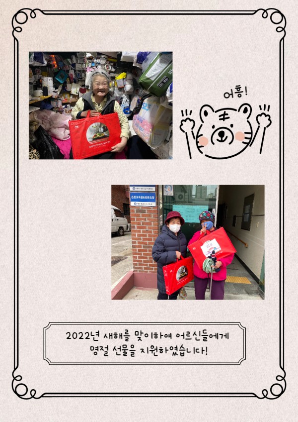 [재가노인지원서비스] 2022년 명절(설) 선물지원 페이지 정보 작성자 은천노인복지회 작성일22-02-07 15:21 조회19,314회 댓글0건 관련링크 이전글 다음글 목록 답변 본문 2022년 새해를 맞이하여 어르신들에게 선물을 지원하였습니다. 이전글 다음글 목록 답변